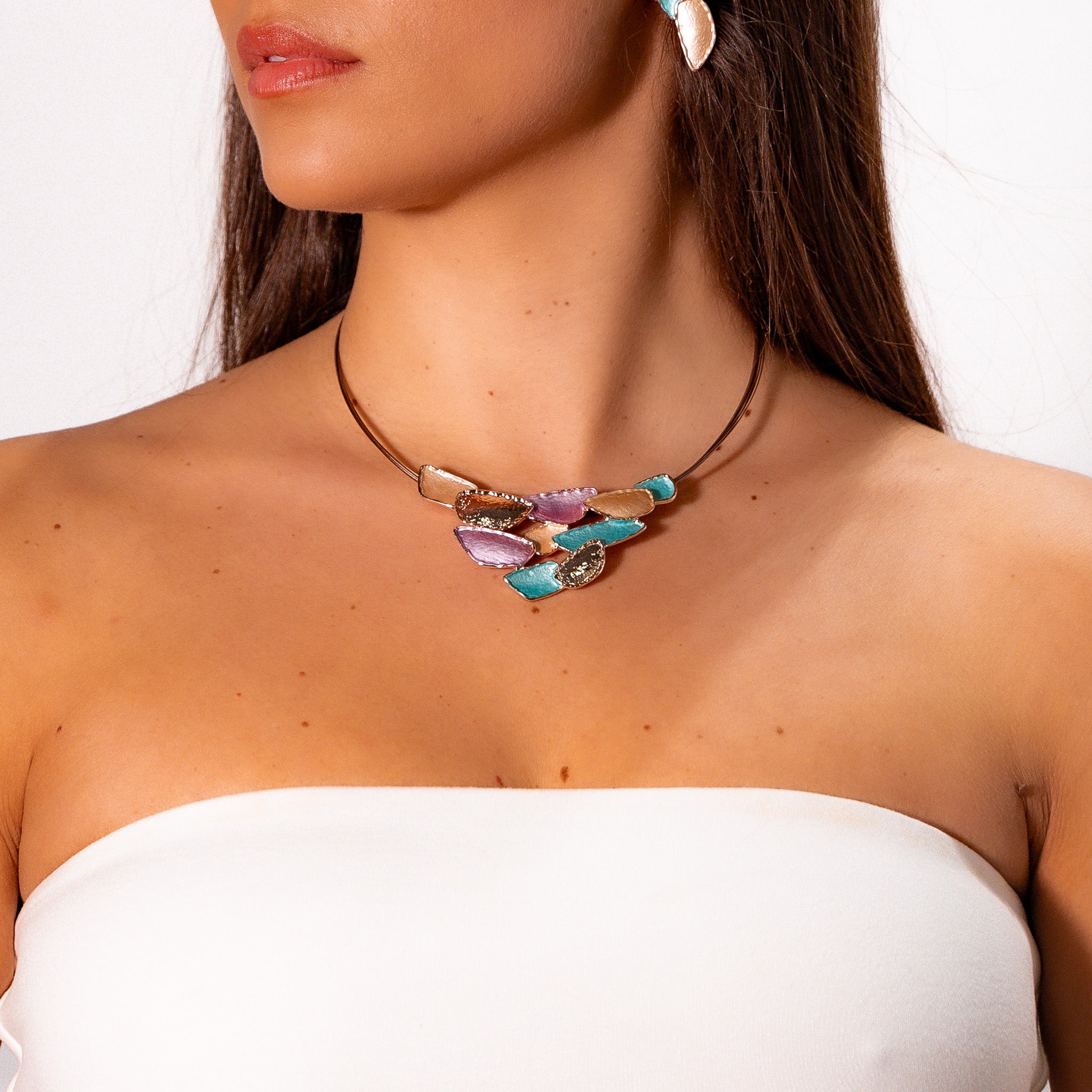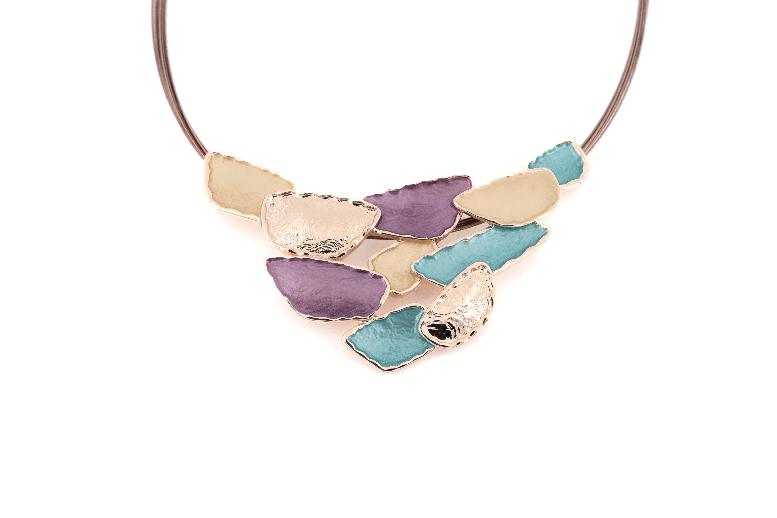Steel cable necklace hand-painted with three enamels.